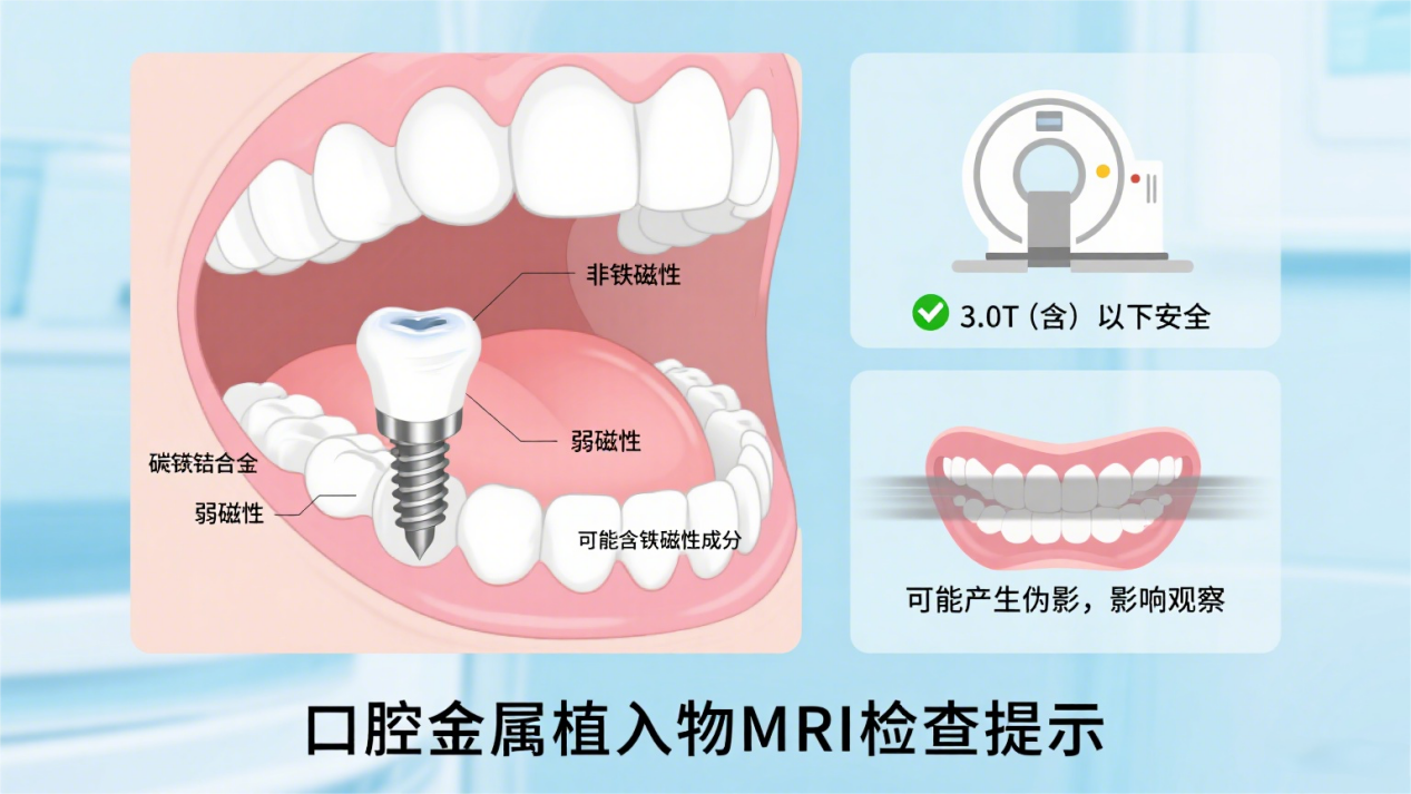 种植牙、固定假牙、烤瓷牙这些“口腔金属件”,很多含有金属或合金,有些甚至带点铁磁性。不过不用太担心:在 3.0 T(含)以下的 MRI 设备中,它们通常不会移位或变形,只是可能会让图像出现伪影,影响口腔及周围组织的观察。